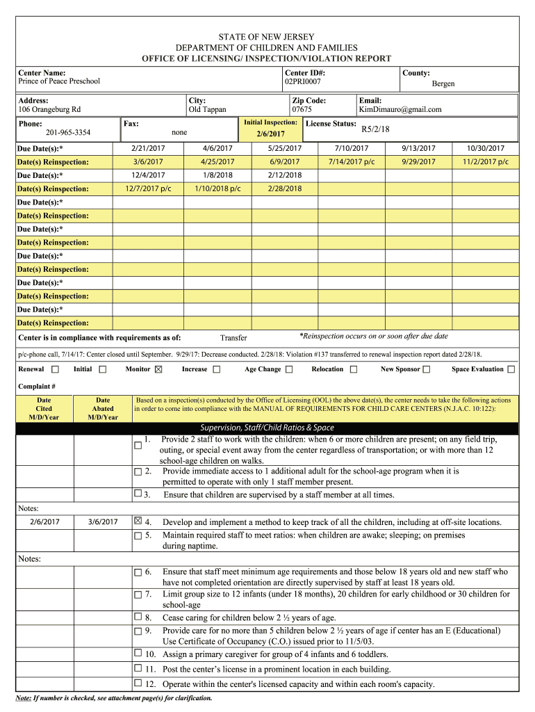 OFFICE OF LICENSING/ INSPECTION/VIOLATION REPORT