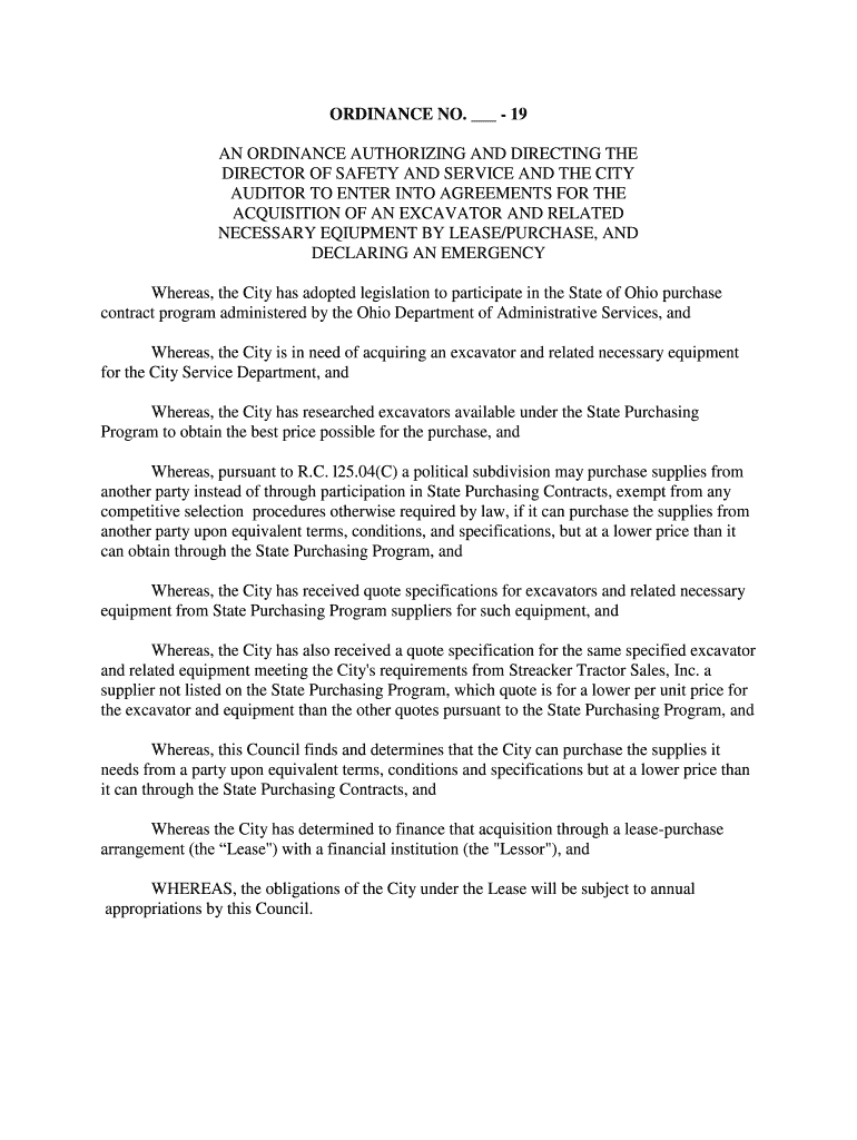 ORDINANCE NO. 19 AN ORDINANCE AUTHORIZING AND DIRECTING THE DIRECTOR OF SAFETY AND SERVICE AND THE CITY AUDITOR TO ENTER INTO AGREEMENTS FOR THE ACQUISITION OF AN EXCAVATOR AND RELATED NECESSARY EQUIPMENT