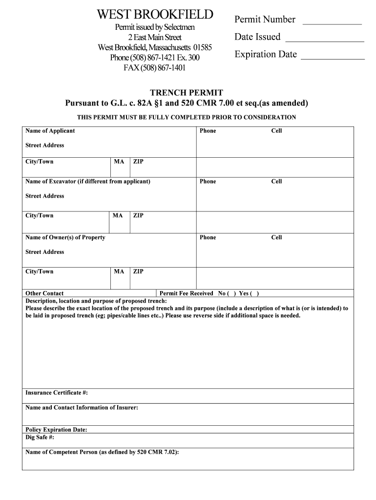 WEST BROOKFIELD Permit issued by Selectmen 2 East Main Street West Brookfield, Massachusetts 01585 Phone (508) 8671421 Ex. 300 FAX (508) 8671401Permit Number Date Issued Expiration Date TRENCH PERMIT