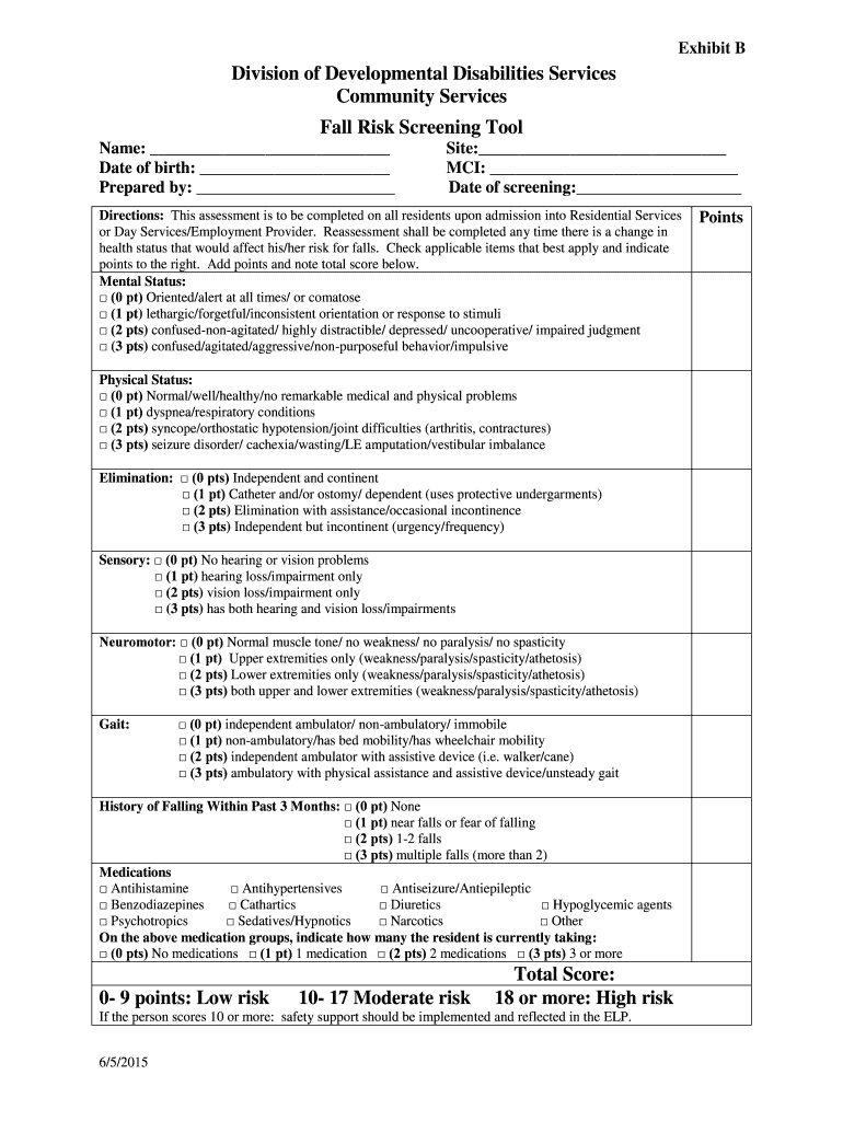Exhibit Division of Developmental Disabilities Services Community Services Fall Risk Screening Tool Name: Date of birth: Prepared by: Site: MCI: Date of screening: Directions: This assessment is to