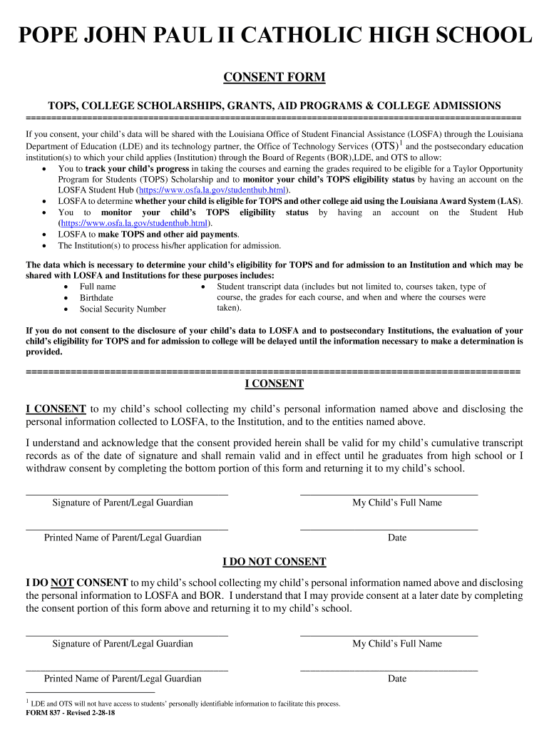 POPE JOHN PAUL II CATHOLIC HIGH SCHOOL Place on school/LEA letterhead: schools name must be included in the header CONSENT FORM TOPS, COLLEGE SCHOLARSHIPS, GRANTS, AID PROGRAMS & COLLEGE ADMISSIONS