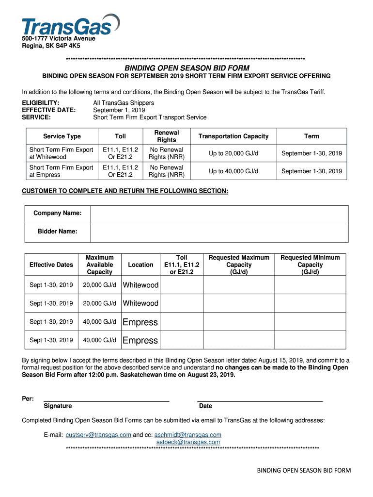 BINDING OPEN SEASON FOR SEPTEMBER 2019 SHORT TERM FIRM EXPORT SERVICE OFFERING