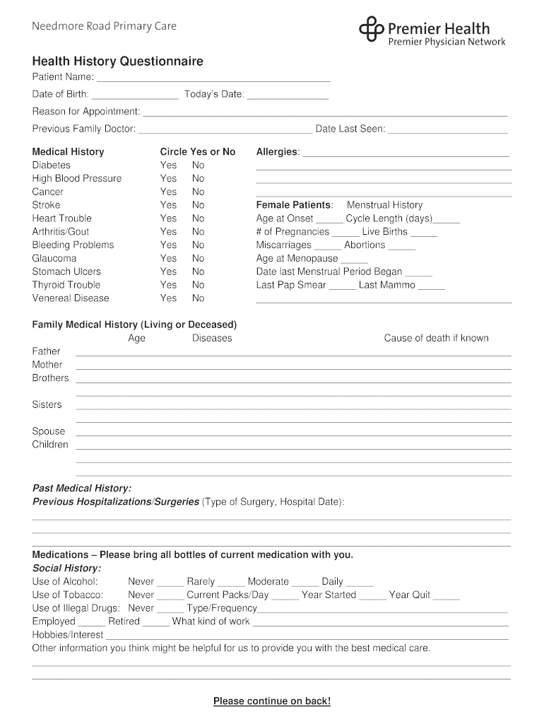 Patient health history questionnaires might also be required by insurance companies or employers for various purposes.