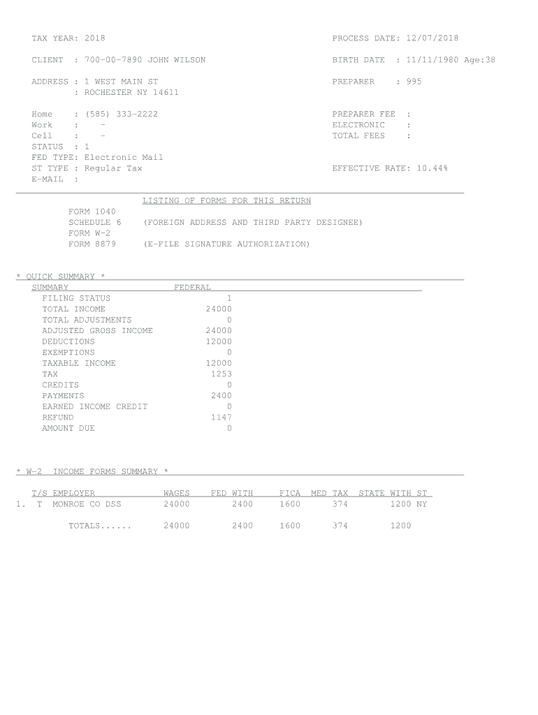TAX YEAR: 2018PROCESS DATE: 12/07/2018CLIENTBIRTH DATE: 11/11/1980 Age:38PREPARER: 995: 700007890 JOHN WILSONADDRESS : 1 WEST MAIN ST : ROCHESTER NY 14611Home : (585) 3332222 PREPARER FEE : Work :