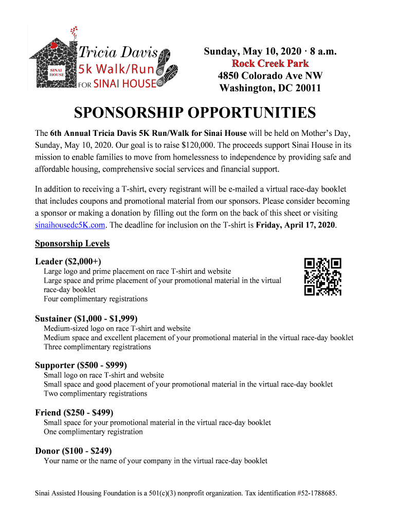 Sunday, May 10, 2020 8 a.m. 4850 Colorado Ave NW Washington, DC 20011SPONSORSHIP OPPORTUNITIES The 6th Annual Tricia Davis 5K Run/Walk for Sinai House will be held on Mother's Day, Sunday, May 10,