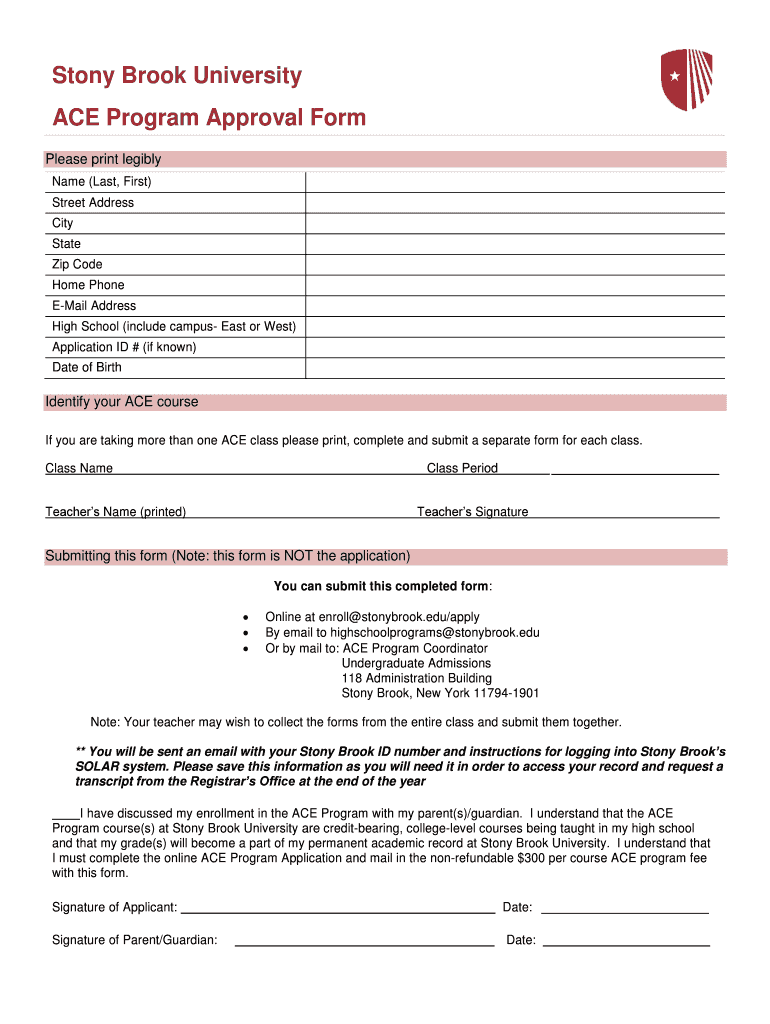 Stony Brook University ACE Program Approval Form Please print legibly Name (Last, First) Street Address City State Zip Code Home Phone Email Address High School (include campus East or West) Application