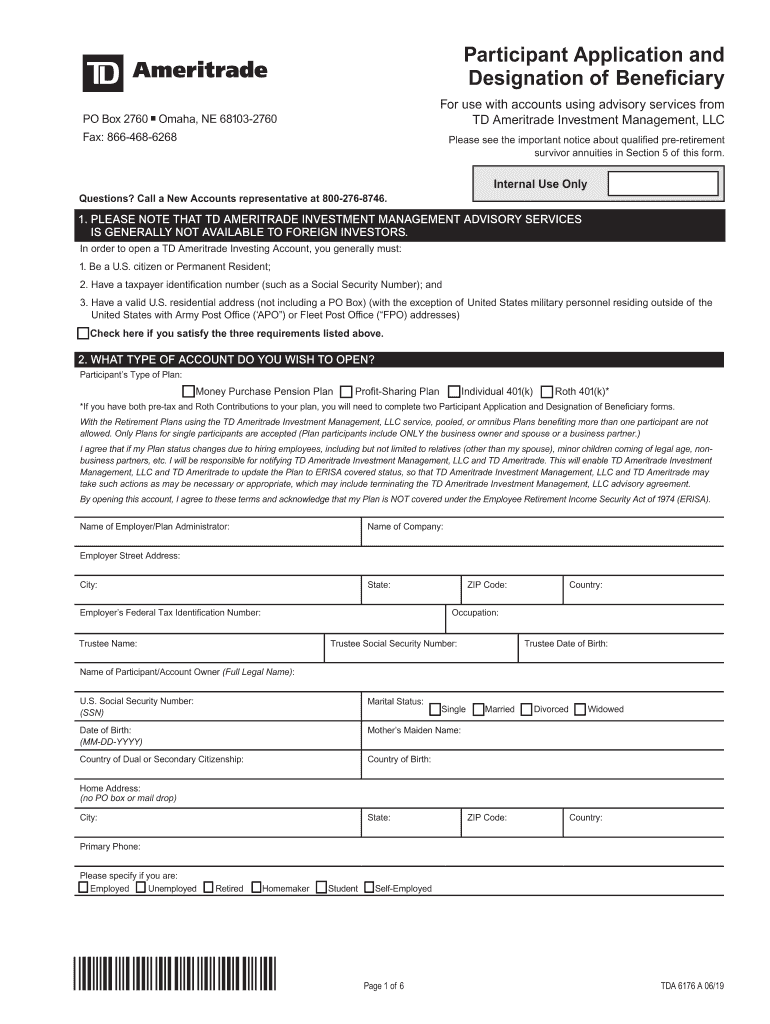 Reset Nonparticipant Application and Designation of Beneficiary For use with accounts using advisory services from TDAmeritrade Investment Management, LL CPO Box 2760 Omaha, NE 681032760 Fax: 8664686268Please