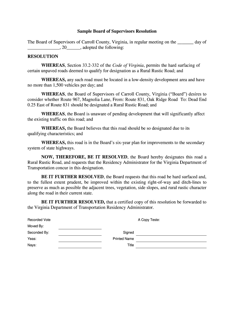 Sample Board of Supervisors Resolution The Board of Supervisors of Carroll County, Virginia, in regular meeting on the day of, 20, adopted the following: RESOLUTION WHEREAS, Section 33.2332 of the