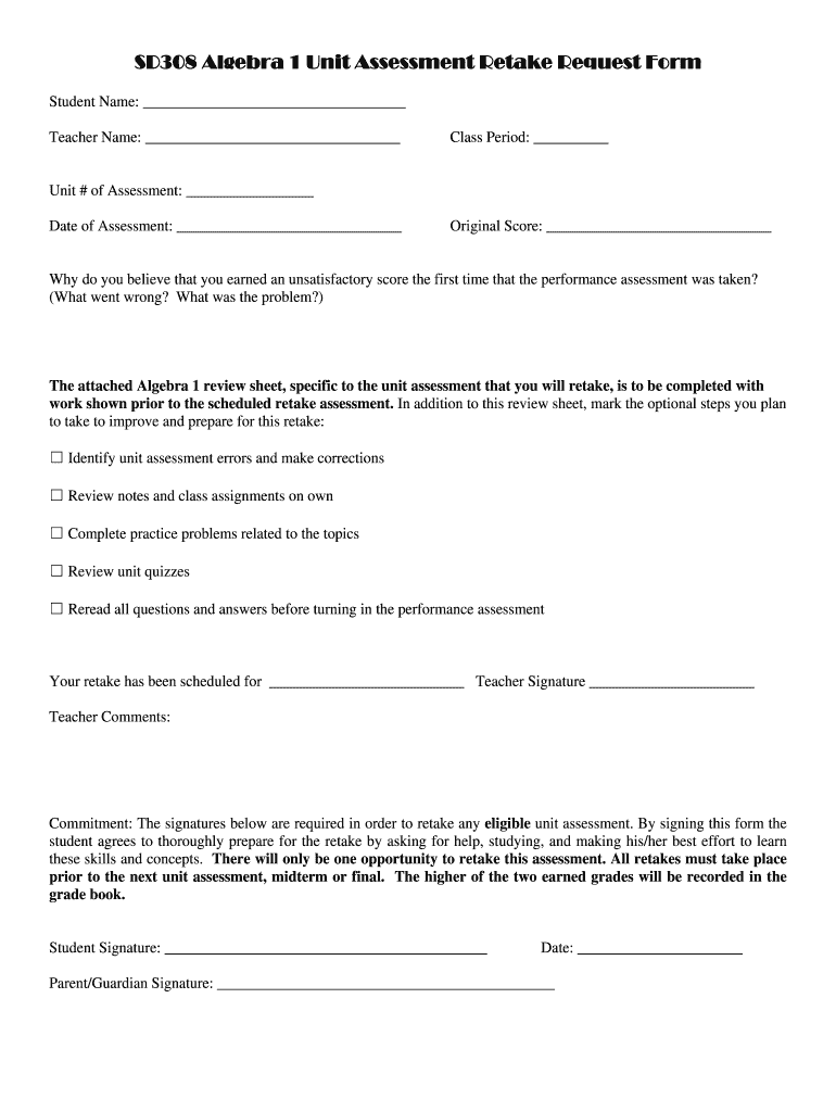 SD308 Algebra 1 Unit Assessment Retake Request Form Student Name: Teacher Name: Class Period: Unit # of Assessment: Date of Assessment: Original Score: Why do you believe that you earned an unsatisfactory