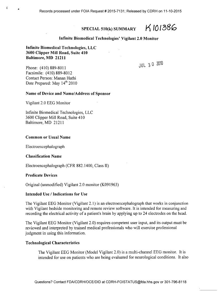 Records processed under FOIA Request # 20157131; Released by CDR on 11102015SPECIAL 510(k) SUMMARY d13 %6Infinite Biomedical Technologies\' Vigilant 2.0 Monitor