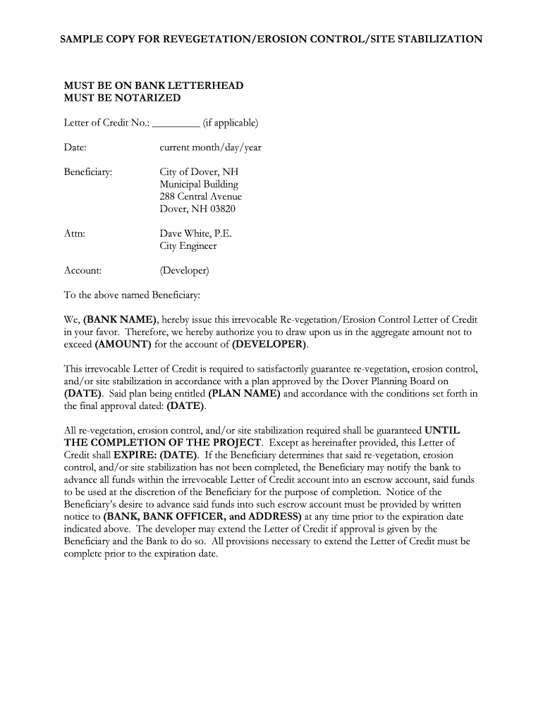 SAMPLE COPY FOR VEGETATION/EROSION CONTROL/SITE STABILIZATIONMUST BE ON BANK LETTERHEAD MUST BE NOTARIZED Letter of Credit No.: (if applicable) Date:current month/day/yearBeneficiary:City of Dover,