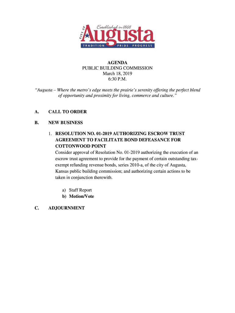 AGENDA PUBLIC BUILDING COMMISSION March 18, 2019 6:30 P.M. Augusta Where the metros edge meets the prairies' serenity offering the perfect blend of opportunity and proximity for living, commerce and