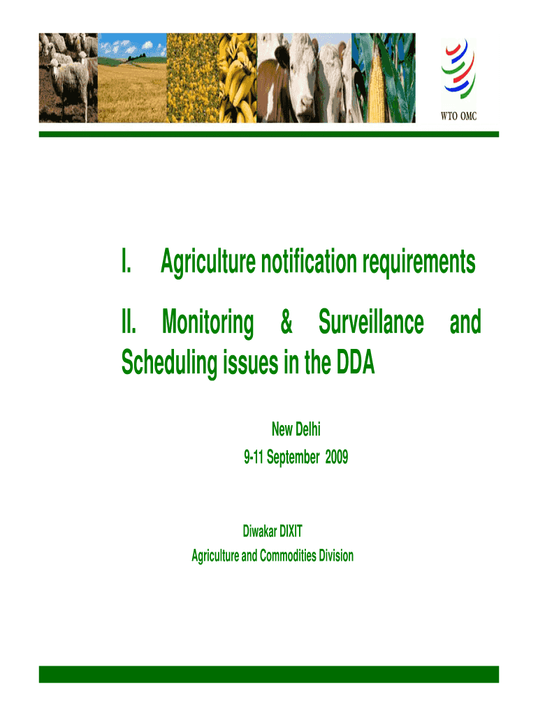 I. Agriculture g notification requirements Wii. Monitoring & Surveillance II. Scheduling issues in the DDA New Delhi 911 September 2009Diwakar DIGIT Agriculture and Commodities DivisionandWTO Committee