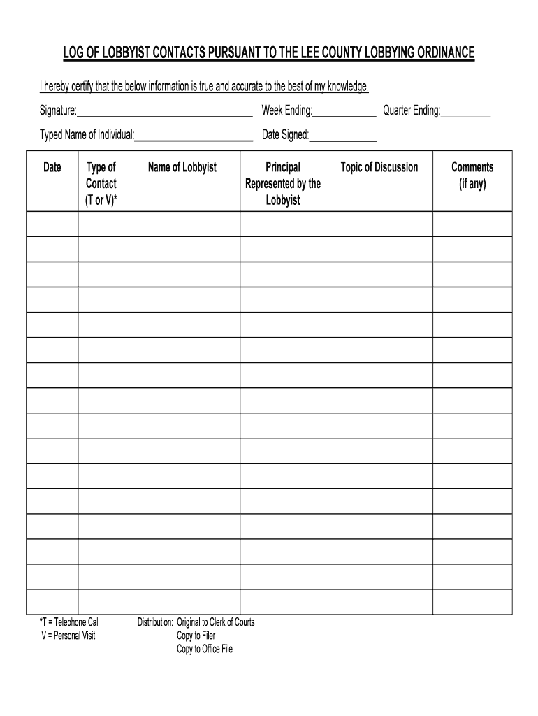 Get the free LOG OF LOBBYIST CONTACTS PURSUANT TO THE LEE COUNTY LOBBYING ORDINANCE