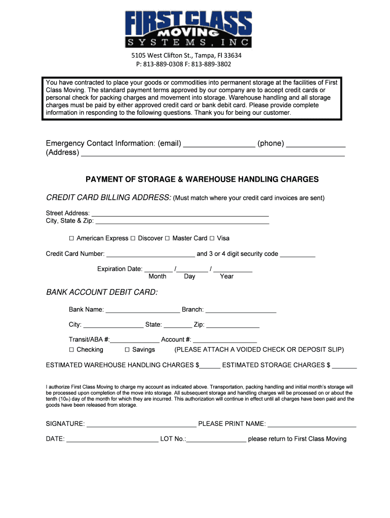 5105WestCliftonSt., Tampa,Fl33634 P:8138890308F:8138893802You have contracted to place your goods or commodities into permanent storage at the facilities of First Class Moving