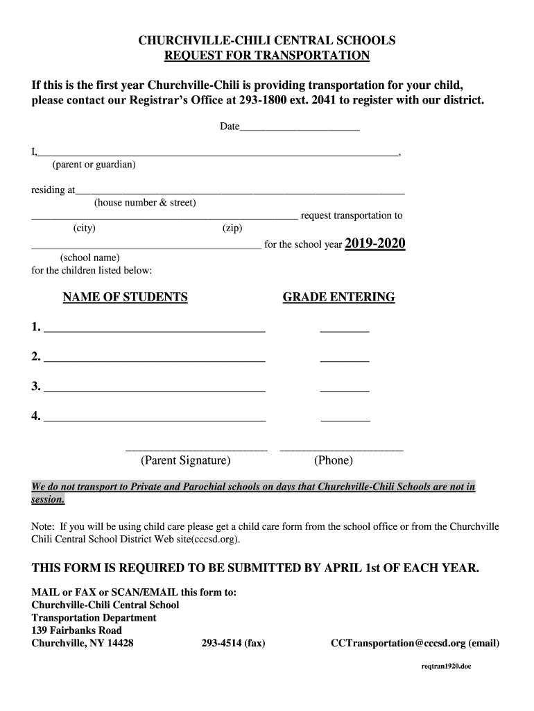 CHURCHVILLECHILI CENTRAL SCHOOLS REQUEST FOR TRANSPORTATION If this is the first year ChurchvilleChili is providing transportation for your child, please contact our Registrars Office at 2931800 ext.