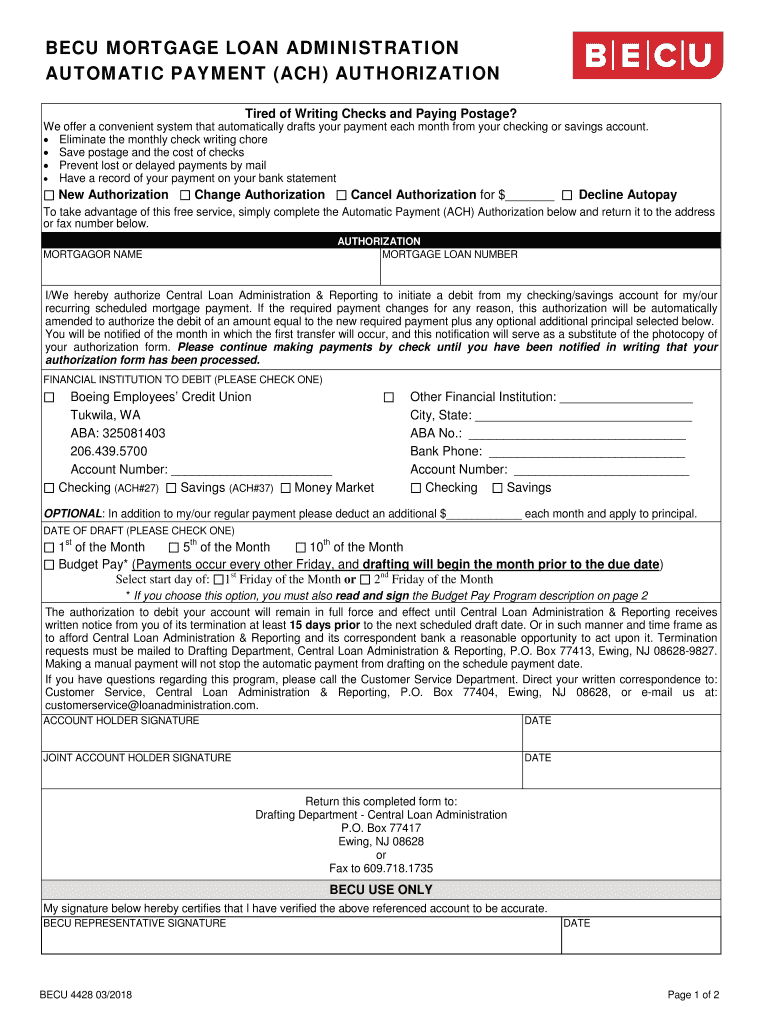 BEAU MORTGAGE LOAN ADMINISTRATION AUTOMATIC PAYMENT (ACH) AUTHORIZATION Tired of Writing Checks and Paying Postage? We offer a convenient system that automatically drafts your payment each month from