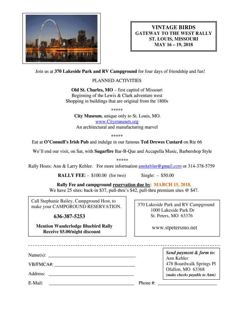 VINTAGE BIRDS GATEWAY TO THE WEST RALLY ST. LOUIS, MISSOURI MAY 16 19, 2018Join us at 370 Lakeside Park and RV Campground for four days of friendship and fun! PLANNED ACTIVITIES Old St. Charles, MO
