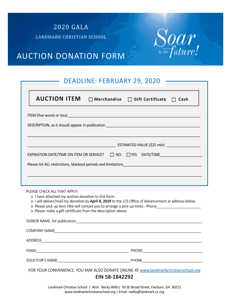 2020 GALA LANDMARK CHRISTIAN SCHOOLAUCTION DONATION FORM DEADLINE: FEBRUARY 29, 2020, AUCTION ITEMMerchandiseGift CertificateCashITEM (five words or fewer) DESCRIPTION, as it should appear in publication