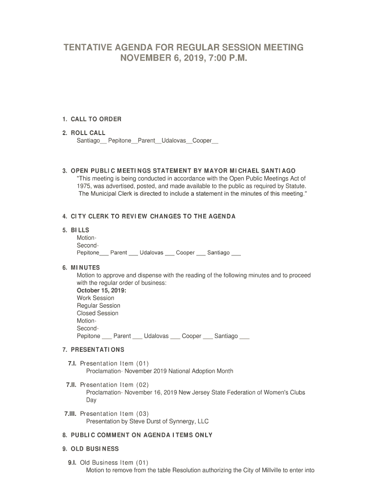 TENTATIVE AGENDA FOR REGULAR SESSION MEETING NOVEMBER 6, 2019, 7:00 P.M.1. CALL TO ORDER 2. ROLL CALL Santiago Epitome Parent Dallas Cooper 3. OPEN PUBLIC MEETINGS STATEMENT BY MAYOR MICHAEL SANTIAGO