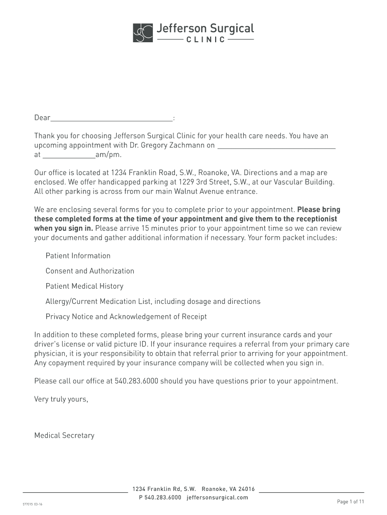 Dear : Thank you for choosing Jefferson Surgical Clinic for your health care needs. You have an upcoming appointment with Dr. Gregory Eichmann on at am/pm. Our office is located at 1234 Franklin Road,