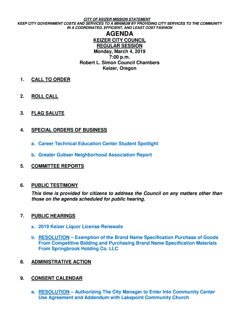 Agenda in Keizer, Oregon is a list of items to be discussed or acted upon at a meeting.