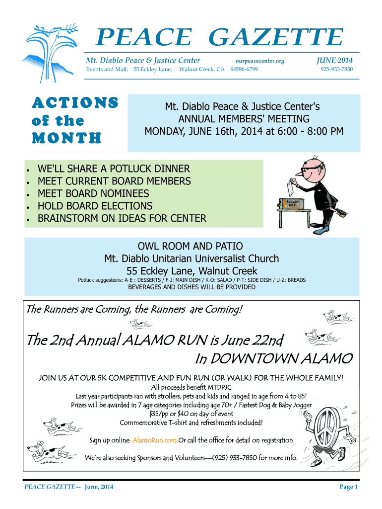 PEACE GAZETTE Mt. Diablo Peace & Justice Centerourpeacecenter.org ourpeacecenter.org December, 2013January, Dec., 2013Jan., JUNE2014 2014 2014 55 Beckley Events and Lane Mailing Mail: 55 address: