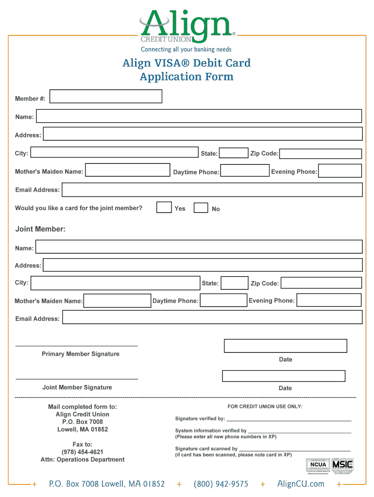 Align VISA Debit Card Application Form Member #: Name: Address: City:State:Mother's Maiden Name:Daytime Phone:Zip Code: Evening Phone:Email Address: Would you like a card for the joint member? YesNoJoint