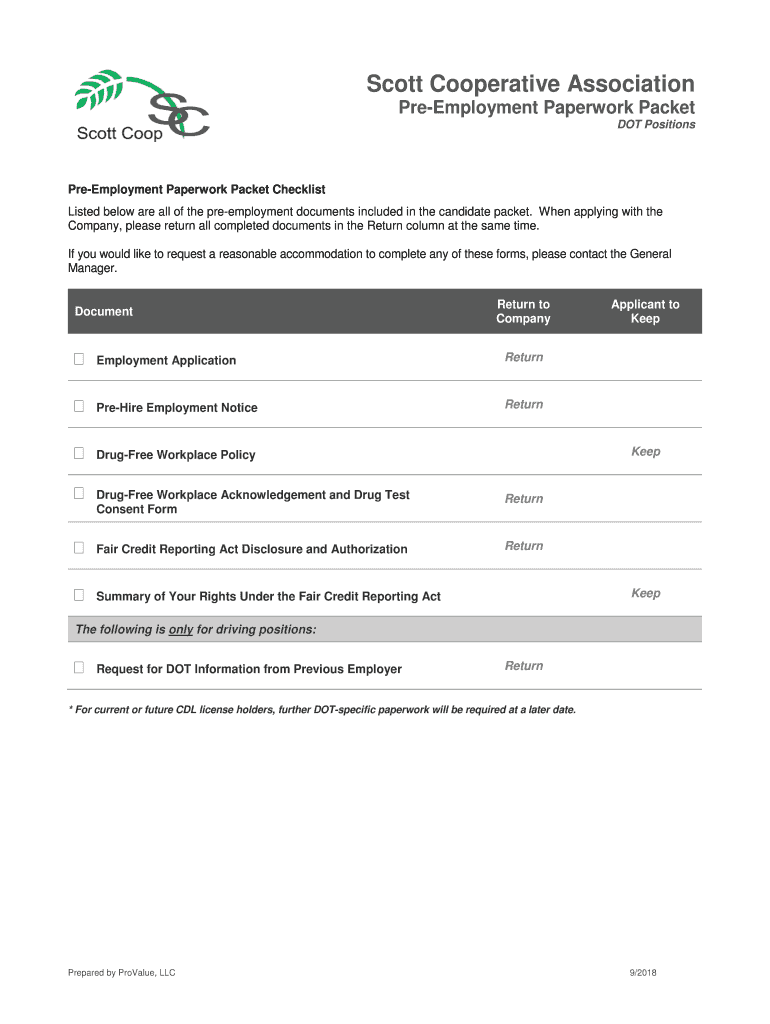 DOT PositionsPreEmployment Paperwork Packet Checklist