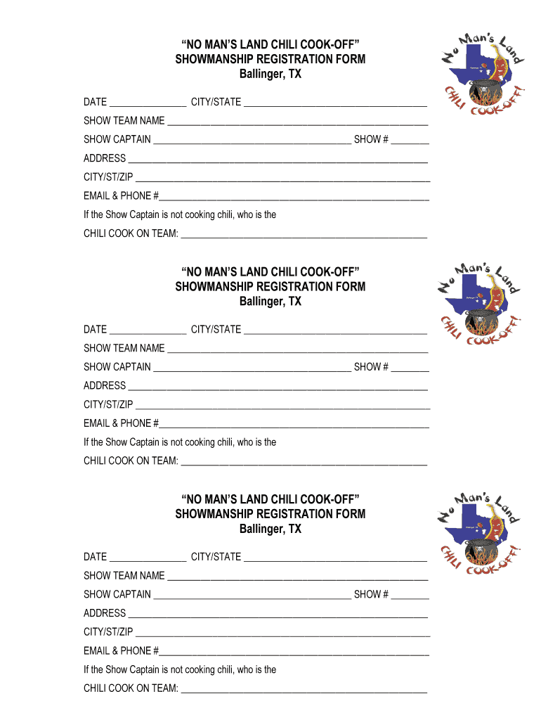 NO Men LAND CHILI COOKOUT SHOWMANSHIP REGISTRATION FORM Balling her, TX DATE CITY/STATE SHOW TEAM NAME SHOW CAPTAIN SHOW # ADDRESS CITY/ST/ZIP EMAIL & PHONE # If the Show Captain is not cooking chili,