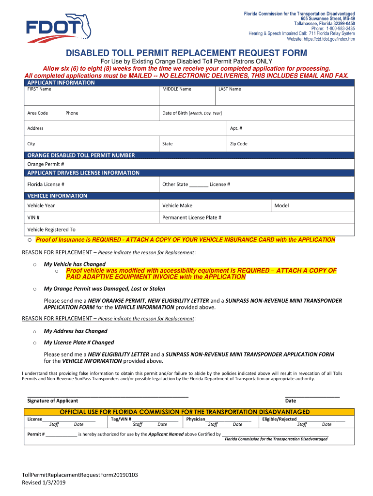 Obtain an application form for a disabled toll permit replacement from the appropriate authority or website.