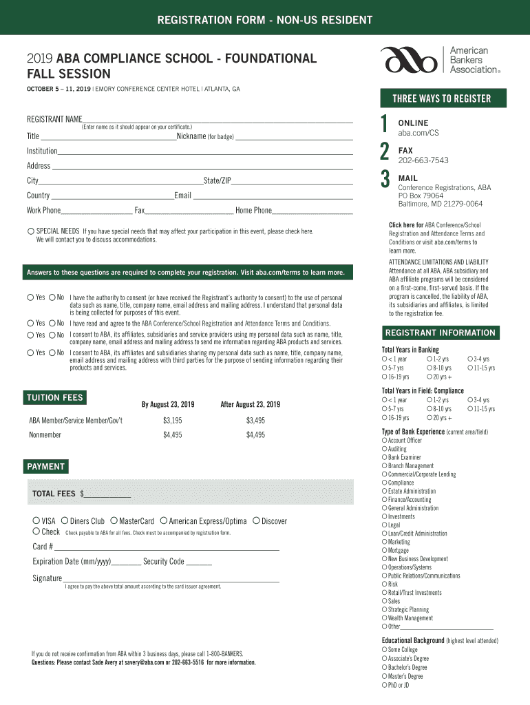 REGISTRATION FORM BONUS RESIDENT2019 ABA COMPLIANCE SCHOOL FOUNDATIONAL FALL SESSION OCTOBER 5 11, 2019 EMORY CONFERENCE CENTER HOTEL ATLANTA, THREE WAYS TO REGISTERREGISTRANT NAME (Enter name as