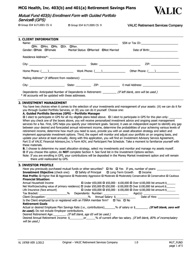 MCG Health, Inc. 403(b) and 401(a) Retirement Savings PlansMutual Fund 403(b) Enrollment Form with Guided Portfolio Service (GPS) Group ID# 61712001 CS: 6VALIC Retirement Services Company Group ID#