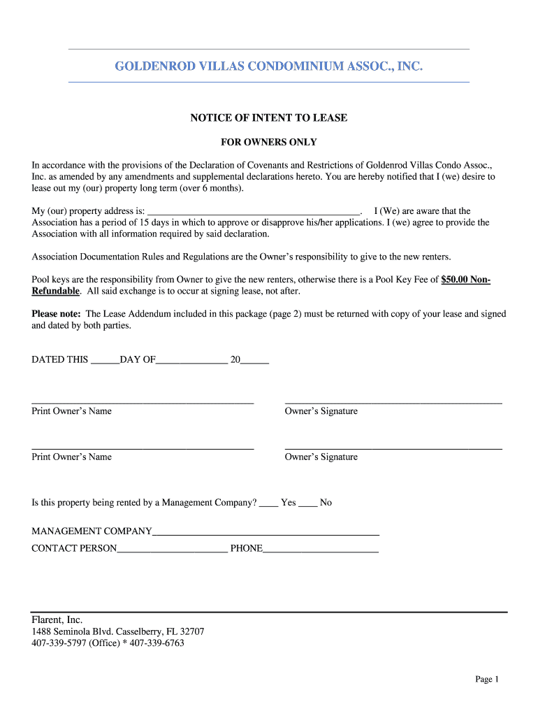 GOLDENROD VILLAS CONDOMINIUM ASSOC., INC.NOTICE OF INTENT TO LEASE FOR OWNERS ONLY In accordance with the provisions of the Declaration of Covenants and Restrictions of Goldenrod Villas Condo Assoc.,