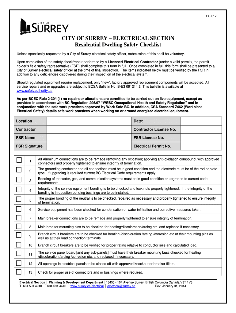 EG017CITY OF SURREY ELECTRICAL SECTION Residential Dwelling Safety Checklist Unless specifically requested by a City of Surrey electrical safety officer, submission of this shall be voluntary. Upon