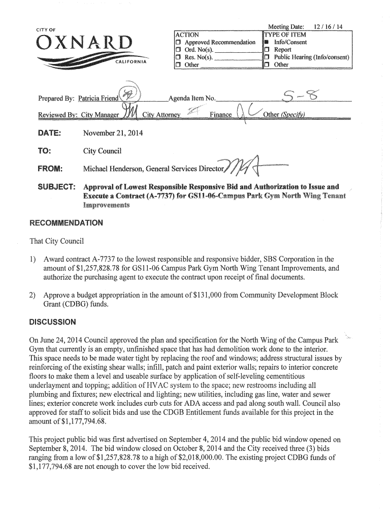 CITY FACTION LI Approved Recommendation LI ORD. No(s). LI Res. No(s). LI OtherCALIFORNIAPrepared By: Patricia Friend,1M beef mg DAE: t 12 I 16 I 14 TYPE OF ITEM 11111 Info/Consent LI Report LI Public