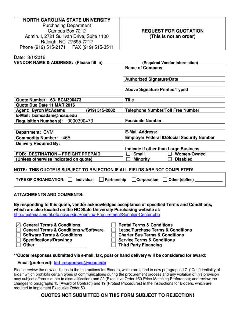 NORTH CAROLINA STATE UNIVERSITY Purchasing Department Campus Box 7212 Admin. I, 2721 Sullivan Drive, Suite 1100 Raleigh, NC 276957212 Phone (919) 5152171 FAX (919) 5153511REQUEST FOR QUOTATION (This