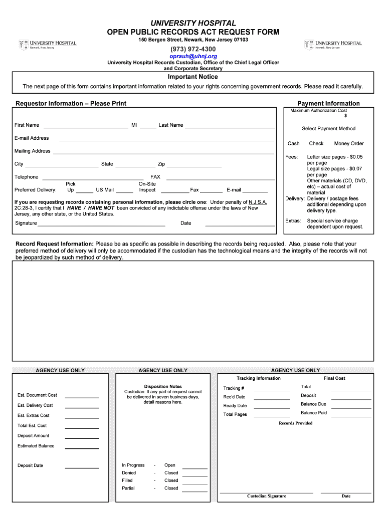 UNIVERSITY HOSPITAL OPEN PUBLIC RECORDS ACT REQUEST FORM 150 Bergen Street, Newark, New Jersey 07103(973) 9724300 Oprah hung.org University Hospital Records Custodian, Office of the Chief Legal Officer