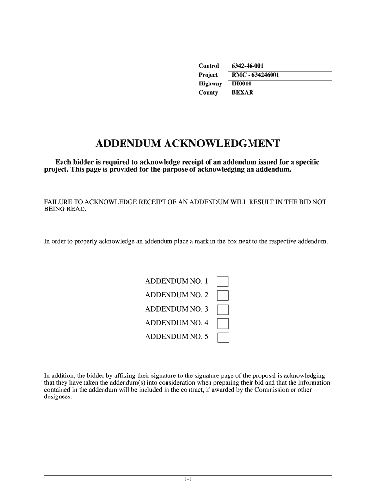 Control Project Highway County634246001 RMC 634246001 IH0010 BEXARADDENDUM ACKNOWLEDGMENT Each bidder is required to acknowledge receipt of an addendum issued for a specific project. This page is