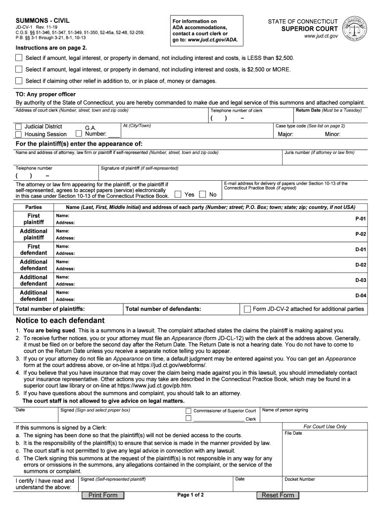 SUMMONS CIVILJDCV1 Rev. 1119 C.G.S. 51346, 51347, 51349, 51350, 5245a, 5248, 52259; P.B. 31 through 321, 81, 1013STATE OF Connecticut information on ADA accommodations, contact a court clerk or go