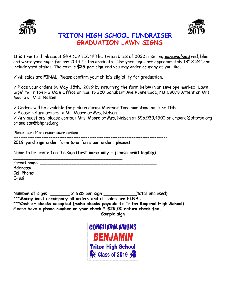 TRITON HIGH SCHOOL FUNDRAISER GRADUATION LAWN SIGNS It is time to think about GRADUATION! The Triton Class of 2022 is selling personalized red, blue and white yard signs for any 2019 Triton graduate.