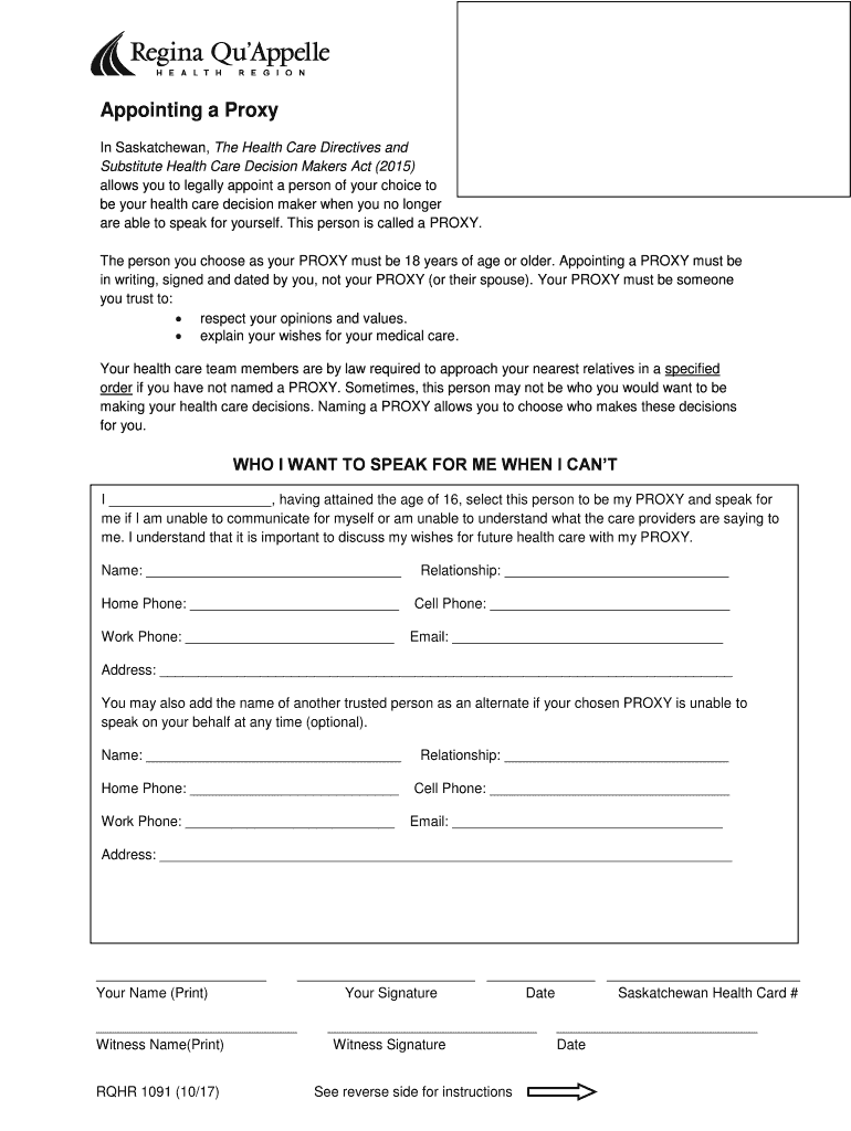 Appointing a Proxy In Saskatchewan, The Health Care Directives and Substitute Health Care Decision Makers Act (2015) allows you to legally appoint a person of your choice to be your health care decision