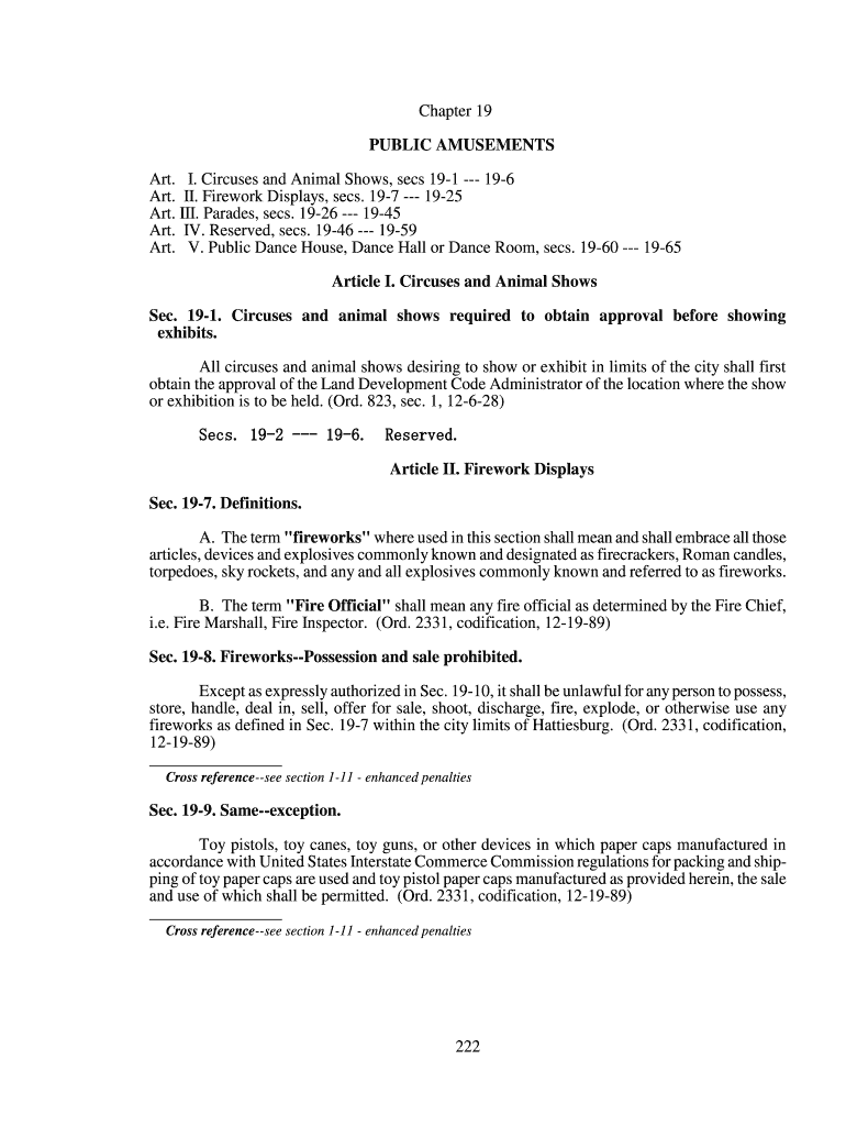 Chapter 19 PUBLIC AMUSEMENTS Art. I. Circuses and Animal Shows, secs 191 196 Art. II. Firework Displays, secs. 197 1925 Art. III. Parades, secs. 1926 1945 Art. IV. Reserved, secs. 1946 1959 Art. V.