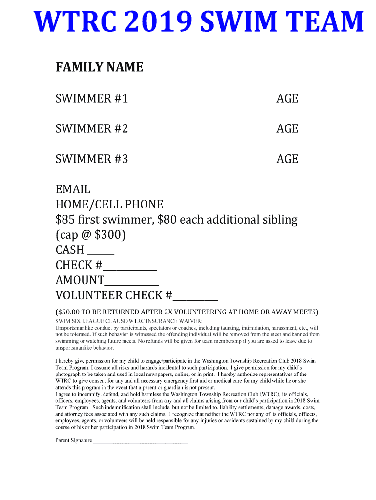 FAMILY NAME SWIMMER #1AGESWIMMER #2AGESWIMMER #3AGEEMAIL HOME/CELL PHONE $85 first swimmer, $80 each additional sibling (cap $300) CASH CHECK # AMOUNT VOLUNTEER CHECK # ($50.00 TO BE RETURNED AFTER