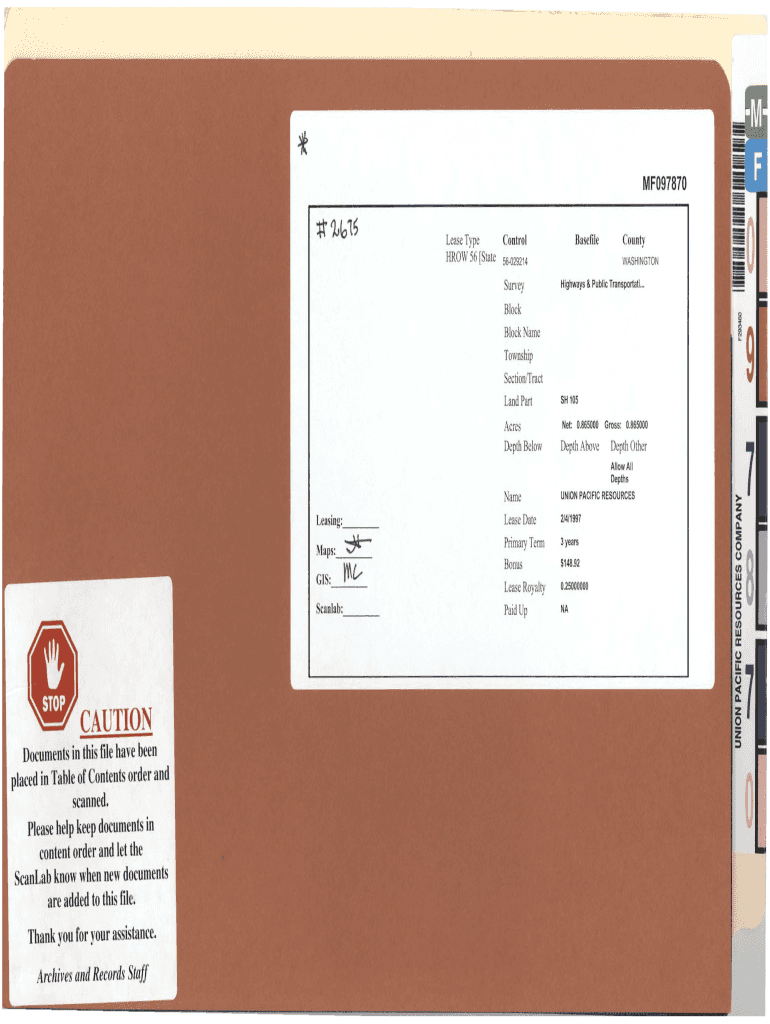(MF097870 Lease Type HOW 56 StateControlBasefileWASHINGTON5602921 4SurveyCountyHighways & Public Transportation. . Block Name Township Section/Tract Land Part Acres Depth Below SH 105 Net: 0.865000Gross:
