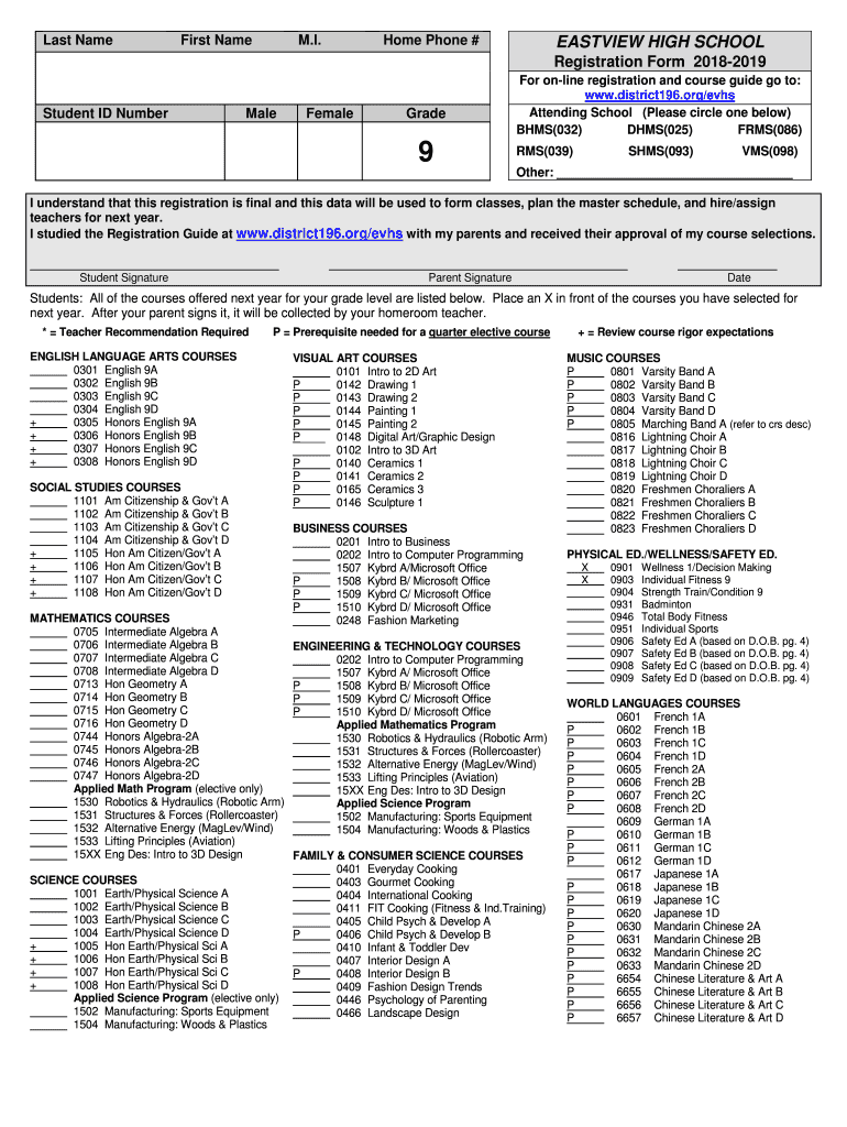 Last NameFirst Name. I. Home Phone #EASIER HIGH SCHOOL Registration Form 20182019Student ID NumberMaleFemaleGrade9For online registration and course guide go to: www.district196.org/evhs Attending