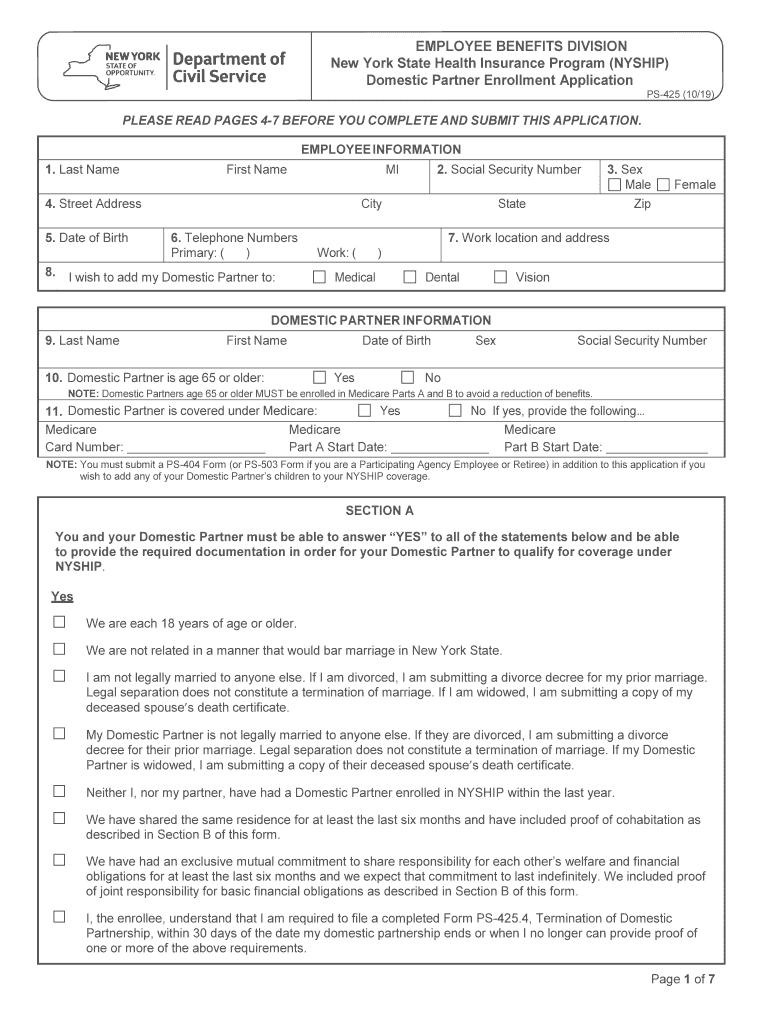 Domestic Partner Enrollment ApplicationPS425 (10/19)PLEASE READ PAGES 47 BEFORE YOU COMPLETE AND SUBMIT THIS APPLICATION.