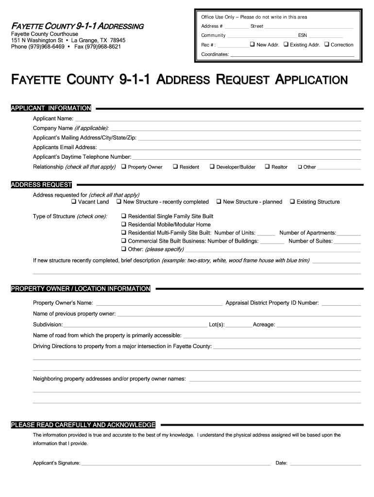 Office Use Only Please do not write in this Lafayette COUNTY 911 ADDRESSINGAddress # Street Fayette County Courthouse 151 N Washington St La Grange, TX 78945 Phone (979)9686469 Fax (979)9688621Community