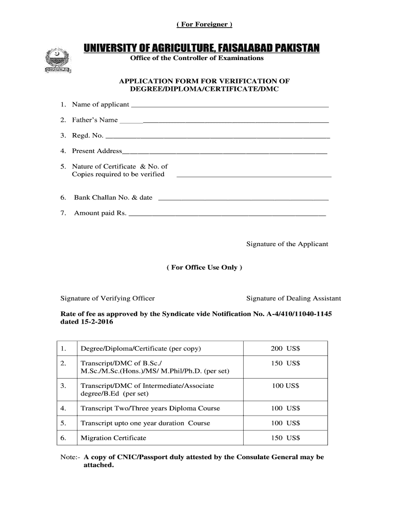 (For Foreigner)UNIVERSITY OF AGRICULTURE, FAISALABAD PAKISTAN Office of the Controller of ExaminationsAPPLICATION FORM FOR VERIFICATION OF DEGREE/DIPLOMA/CERTIFICATE/DMC 1. Name of applicant 2. Fathers