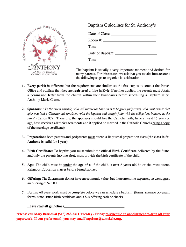 Baptism Guidelines for St. Anthony's Date of Class: Room #: Time: Date of Baptism: Time: The baptism is usually a very important moment and desired for many parents. For this reason, we ask that you